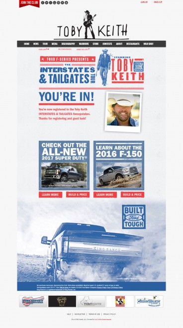 Consumers were invited to enter via a sweepstakes microsite for a chance to win a 2017 Ford Super Duty and an "interstate adventure" that included a Toby Keith concert.